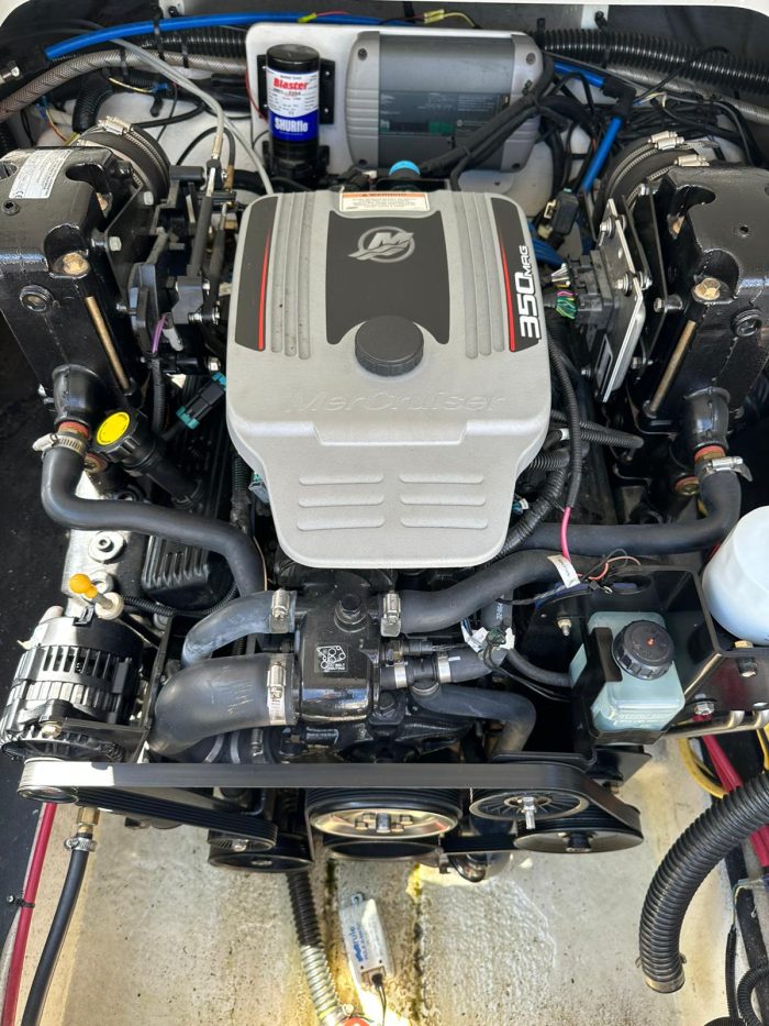 The hull isn’t the only thing that’s balanced, though. The power selection of a 300hp MerCruiser 350 Magnum MPI, combined with a Bravo 3 leg and stainless props, gives a satisfying V8 thrill with loads of trim control and thrust.